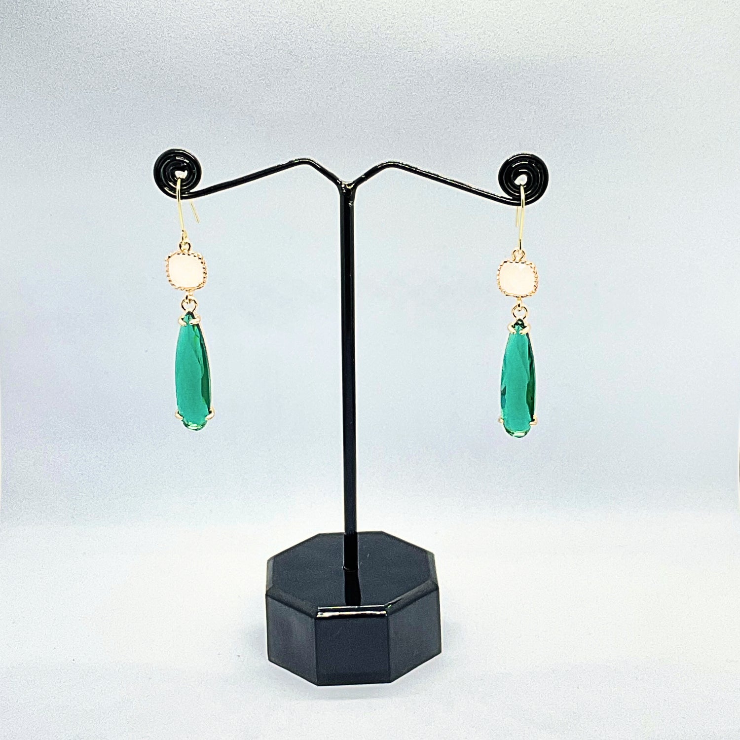 Gold plated brass earrings feature a stunning combination of white and green crystals, set in a sophisticated design. The white crystals add a touch of sparkle, while the green ones provide a vibrant contrast and goes well with formals and traditional outfits.